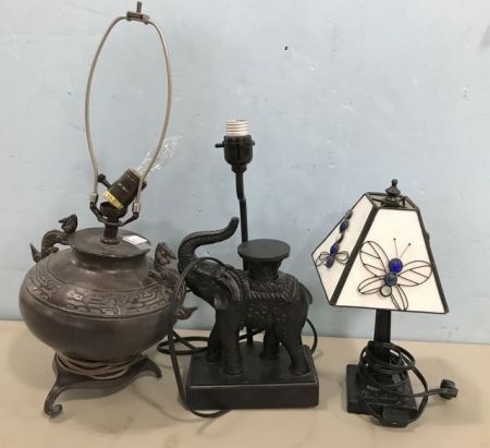 Resin elephant lamp, Oriental style urn lamp with broken leg, faux slag glass small lamp 13"h. Resin elephant lamp, Oriental style urn lamp with broken leg, faux slag glass small lamp 13"h.