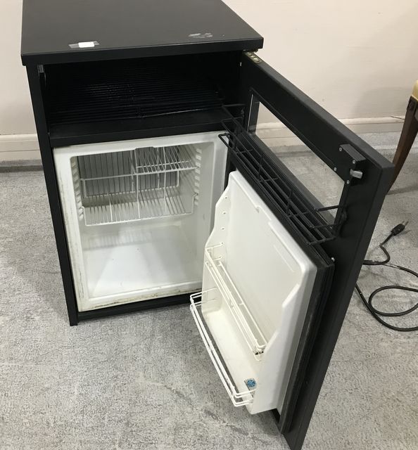 Small Single Door Refrigerator, no key, freezer and frig, black plastic shell, 29"h., 17"w. untested. Small Single Door Refrigerator, no key, freezer and frig, black plastic shell, 29"h., 17"w. untested.
