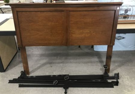 Oak Finish Pressed Wood Head Board, metal frame, full size. Has some finish wear, 48"h., 55"w. Oak Finish Pressed Wood Head Board, metal frame, full size. Has some finish wear, 48"h., 55"w.