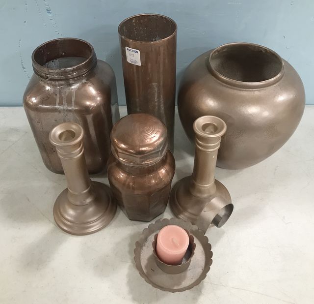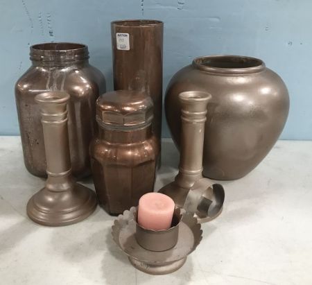 Group of copper painted glassware, vases, candle holders. Group of copper painted glassware, vases, candle holders.