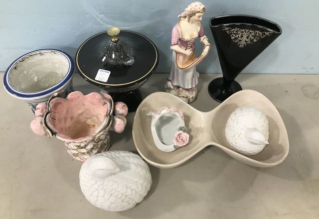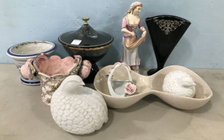 Ceramic small planter, hand painted planter vase, ceramic basket, white ceramic pheasant hens, stoneware divided serving dish, blue and white candy dish and vase, porcelain lady figurine. Ceramic small planter, hand painted planter vase, ceramic basket, white ceramic pheasant hens, stoneware divided serving dish, blue and white candy dish and vase, porcelain lady figurine.