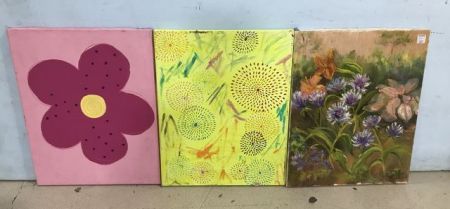Three Unframed paintings, flower, abstract, and flower paintings, 20"h., 16"w. Three Unframed paintings, flower, abstract, and flower paintings, 20"h., 16"w.