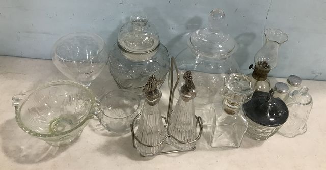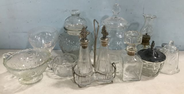 Covered Jars, Decanter, sugar dish, two glass containers with stand, salt & pepper, bowls, mini lantern, etched cup, compote. Covered Jars, Decanter, sugar dish, two glass containers with stand, salt & pepper, bowls, mini lantern, etched cup, compote.