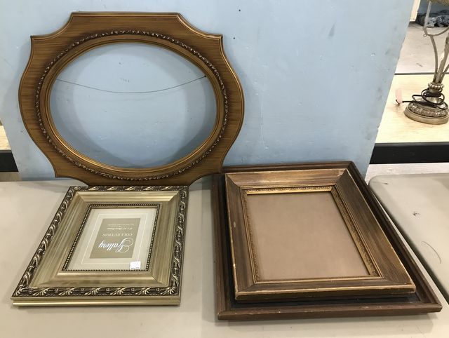 Wood painted oval picture frame 26"h., 21"w., gold gilt frame, two vintage wood frames. Wood painted oval picture frame 26"h., 21"w., gold gilt frame, two vintage wood frames.