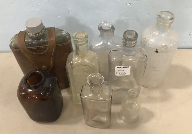 Collection of Vintage Bottles, Lambert Listerine, small amber bottle, Dr. W.B. Caldwell's Syrup Pepsin, other bottles and Glass flask with case. Collection of Vintage Bottles, Lambert Listerine, small amber bottle, Dr. W.B. Caldwell's Syrup Pepsin, other bottles and Glass flask with case.