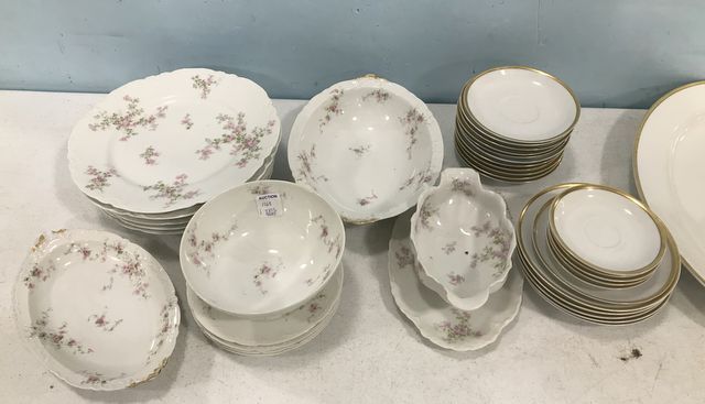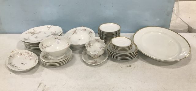 Theodore Haviland china partial sets, 6 plates (some with chips), serving bowl, dessert plates, small platter, gravy boat, gold rim large platter, saucers, dessert plates. Theodore Haviland china partial sets, 6 plates (some with chips), serving bowl, dessert plates, small platter, gravy boat, gold rim large platter, saucers, dessert plates.