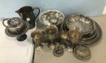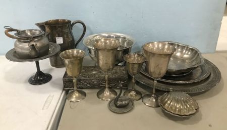 Silver plated trays, compote, pitcher, goblets, shell dish, jewelry box, salad bowl, cup. Silver plated trays, compote, pitcher, goblets, shell dish, jewelry box, salad bowl, cup.