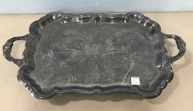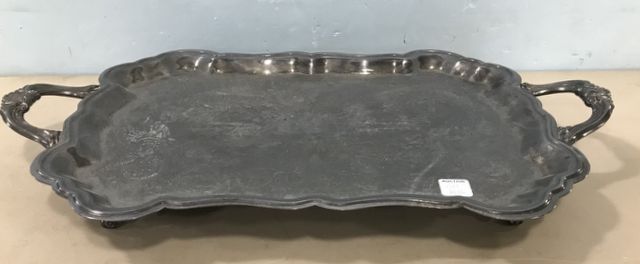Silver Plated Handled Footed Serving Tray, tarnish color, 23"w. Silver Plated Handled Footed Serving Tray, tarnish color, 23"w.