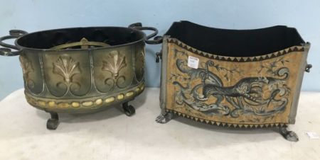 Two Modern Decorative Tin Planters, John Richard footed tin painted planter 8"h., 14"w. and footed tin painted planter. Two Modern Decorative Tin Planters, John Richard footed tin painted planter 8"h., 14"w. and footed tin painted planter.