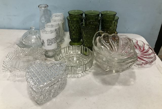Group of collectible glassware, White hall cube pattern cups, milk glass, heart shaped candy dish, dishes, bowls, covered dish. Group of collectible glassware, White hall cube pattern cups, milk glass, heart shaped candy dish, dishes, bowls, covered dish.