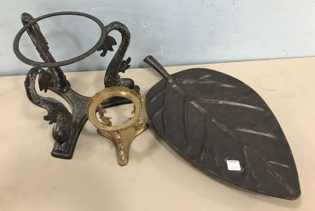 Metal fish design glass bowl stand 9"h., small brass one, and modern metal decor leaf tray 20"L. Metal fish design glass bowl stand 9"h., small brass one, and modern metal decor leaf tray 20"L.