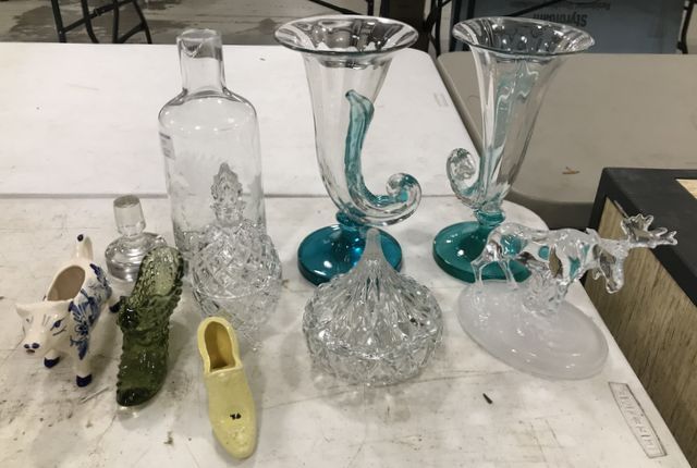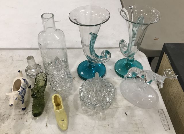 Two art glass urns (one has crack), glass decor moose, two pressed glass candy dishes, Delft style cow figurine, collectible shoes. Two art glass urns (one has crack), glass decor moose, two pressed glass candy dishes, Delft style cow figurine, collectible shoes.