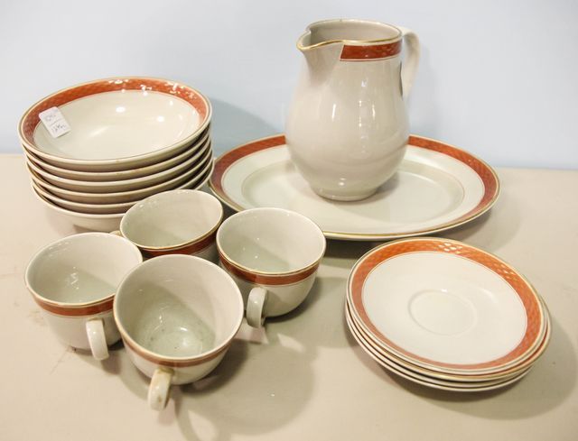Includes pitcher, oval serving dish, four cups, four saucers and six bowls; Pitcher- 6" h. Includes pitcher, oval serving dish, four cups, four saucers and six bowls; Pitcher- 6" h.