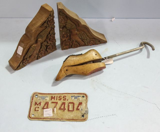 1057 Wood Bird Bookends, Wood Shoe Form & Mississippi Motorcycle Tag
