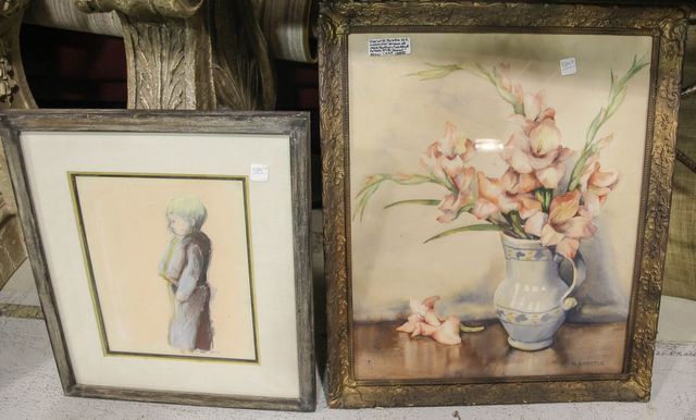 1080 Framed Watercolor of Flowers by Brettle & Drawing of Boy