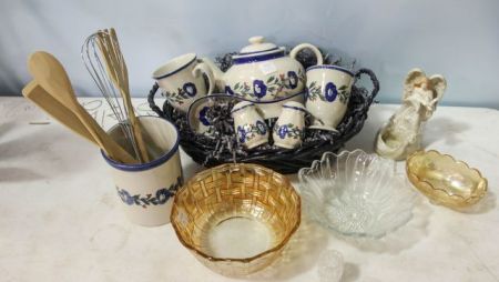 Includes teapot, spoon rest, two mugs, shakers, jar with utensils, basket, four pieces of glass and candle holder Includes teapot, spoon rest, two mugs, shakers, jar with utensils, basket, four pieces of glass and candle holder