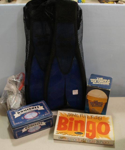 Includes U.S. Divers flippers, child skates, bingo, dominoes and ice cream maker Includes U.S. Divers flippers, child skates, bingo, dominoes and ice cream maker