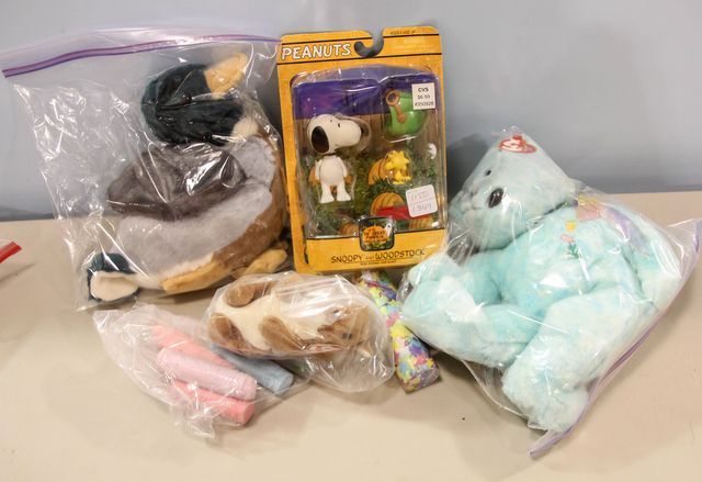 Includes bag of toys, Snoopy play set, Ty ducks, colored chalk, confetti and Ty toys Includes bag of toys, Snoopy play set, Ty ducks, colored chalk, confetti and Ty toys