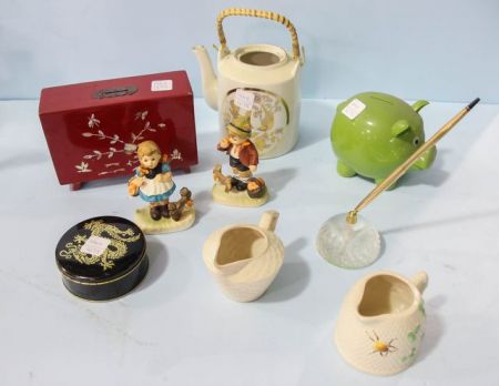 Includes red lacquer bank, pig bank, teapot, tin box, two Japanese creamers, teapot and pin stand Includes red lacquer bank, pig bank, teapot, tin box, two Japanese creamers, teapot and pin stand