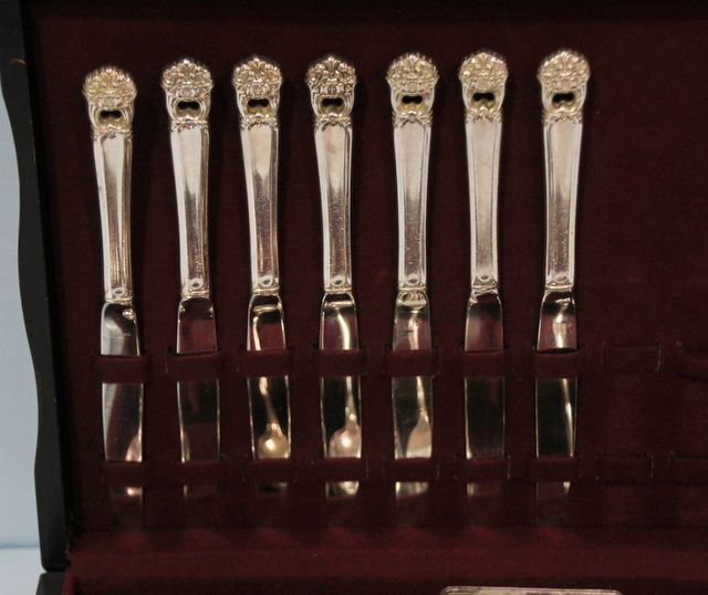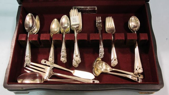 Consists of eight dinner forks, four salad forks, eight cocktail forks, twelve teaspoons, six ice teaspoons, eight tablespoons, four serving pieces and seven knives Consists of eight dinner forks, four salad forks, eight cocktail forks, twelve teaspoons, six ice teaspoons, eight tablespoons, four serving pieces and seven knives