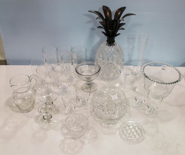 Includes two piece glass pineapple, various glasses, pitcher, candlestick and bowl Includes two piece glass pineapple, various glasses, pitcher, candlestick and bowl