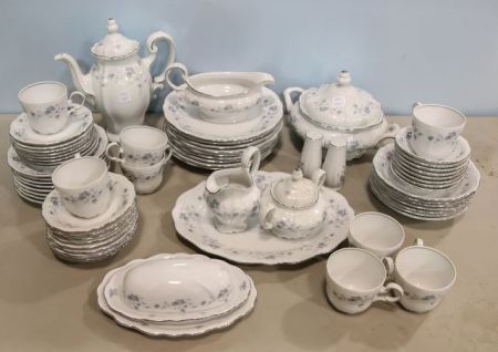 Includes nine dinner plates, eight salad plates, eight bread/butter plates, eight cups (chips), nine saucers, seven soup bowls, eight berry bowls, shakers, sugar/creamer, tureen, platter, gravy, teapot and butter Includes nine dinner plates, eight salad plates, eight bread/butter plates, eight cups (chips), nine saucers, seven soup bowls, eight berry bowls, shakers, sugar/creamer, tureen, platter, gravy, teapot and butter