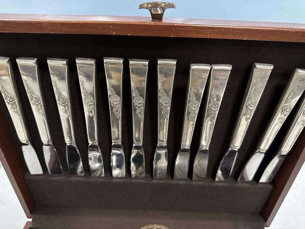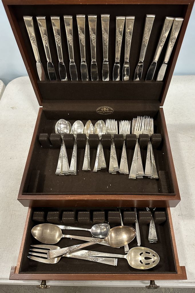 Reed & Barton "Classic Rose" Sterling Flatware, 12 knives, 10 spoons, 12 teaspoons, 11 salad forks, 11 dinner forks, cream spoon, serving spoon and fork, 6 demitasse, butter knife, cocktail fork, two serving spoons, box not included. 74.22 ozt, Location Case by Office Reed & Barton "Classic Rose" Sterling Flatware, 12 knives, 10 spoons, 12 teaspoons, 11 salad forks, 11 dinner forks, cream spoon, serving spoon and fork, 6 demitasse, butter knife, cocktail fork, two serving spoons, box not included. 74.22 ozt, Location Case by Office