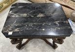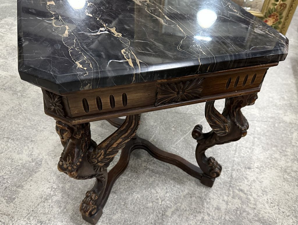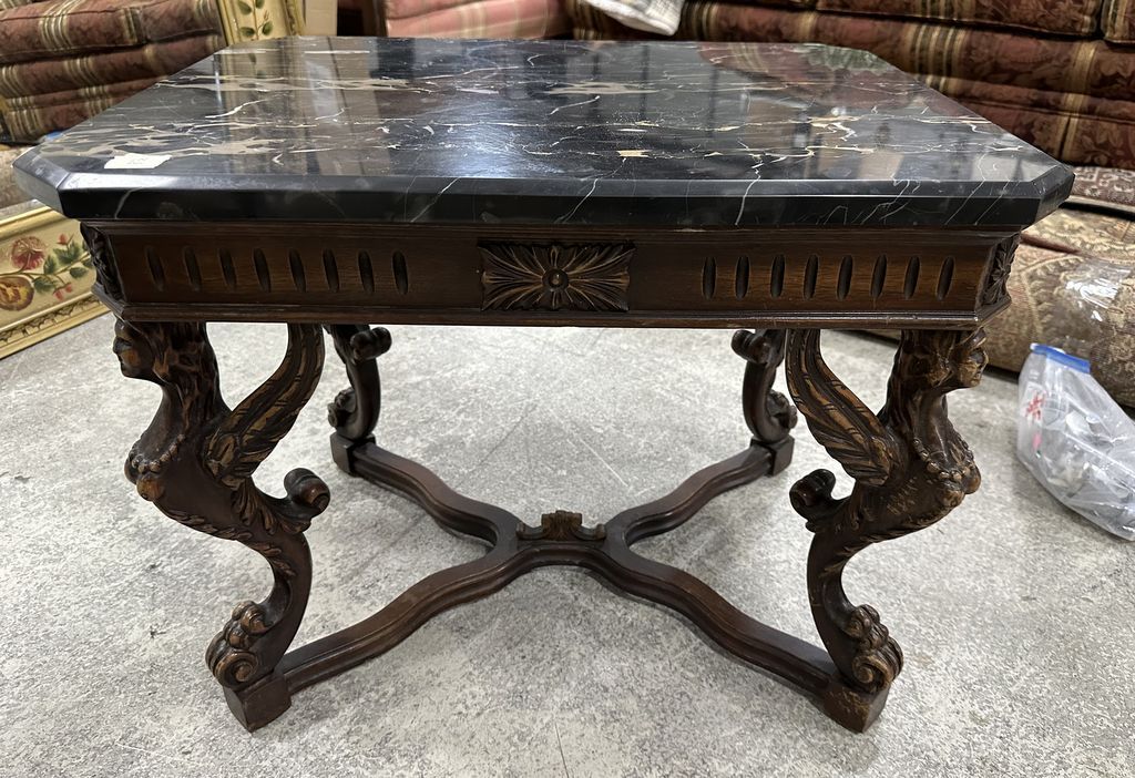 Art Nouveau Style Figural Carved Marble Top Accent Table, Italian marble, carved winged ladies, walnut, 20"h., 25"w. Location Row 2 Art Nouveau Style Figural Carved Marble Top Accent Table, Italian marble, carved winged ladies, walnut, 20"h., 25"w. Location Row 2