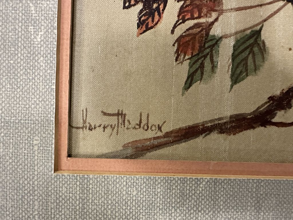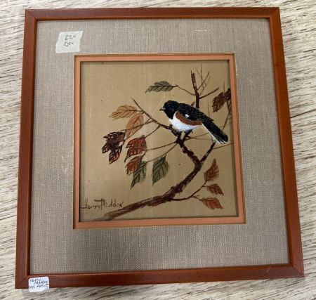 Harry Maddox Bird Painting of Fabric, framed, 11" x 11", Mississippi Artist, Location Front Left Shelves Harry Maddox Bird Painting of Fabric, framed, 11" x 11", Mississippi Artist, Location Front Left Shelves