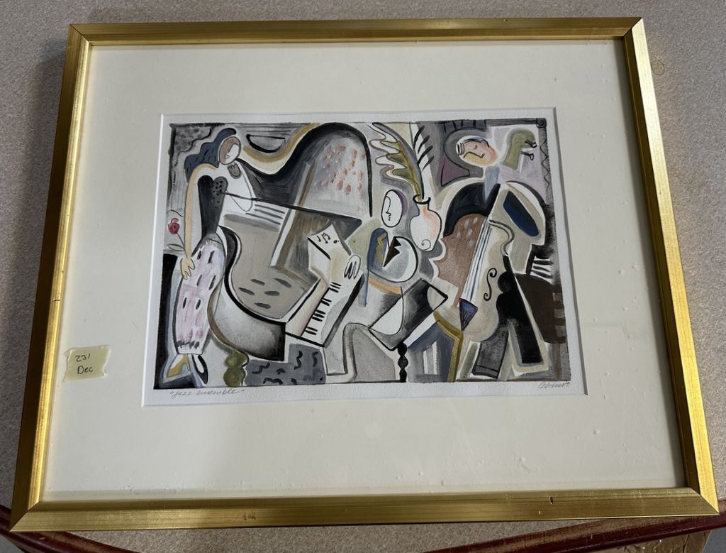 Amy Guist Signed "Jazz Ensemble" Painting, matted, framed, Mississippi Artist, 17"h., 21"w. Location Left office 2 Amy Guist Signed "Jazz Ensemble" Painting, matted, framed, Mississippi Artist, 17"h., 21"w. Location Left office 2