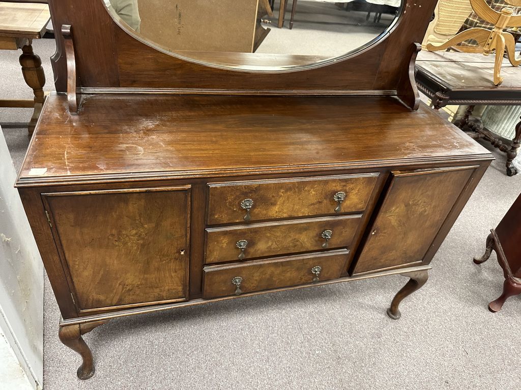 Vintage Queen Anne Buffet, need surface cleaning, beveled mirror, mahogany, 53"h., 58"w., 18"d. Location Row 4 Vintage Queen Anne Buffet, need surface cleaning, beveled mirror, mahogany, 53"h., 58"w., 18"d. Location Row 4