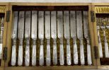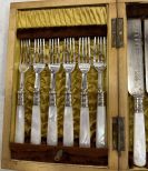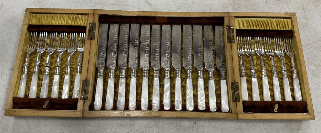 English Mother of Pearl Handled Fish Set, knives and forks, sterling banded, English marks, in nice case, Location Front Left Shelves English Mother of Pearl Handled Fish Set, knives and forks, sterling banded, English marks, in nice case, Location Front Left Shelves