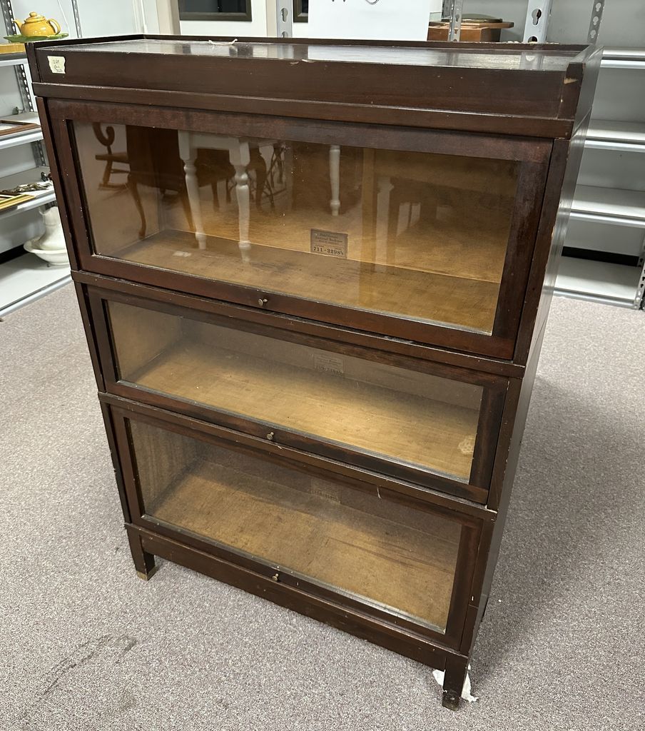 Globe Wernicke Three Stack Barrister, has finish wear, 49"h., 34"w. Location Back Metal Shelves Globe Wernicke Three Stack Barrister, has finish wear, 49"h., 34"w. Location Back Metal Shelves