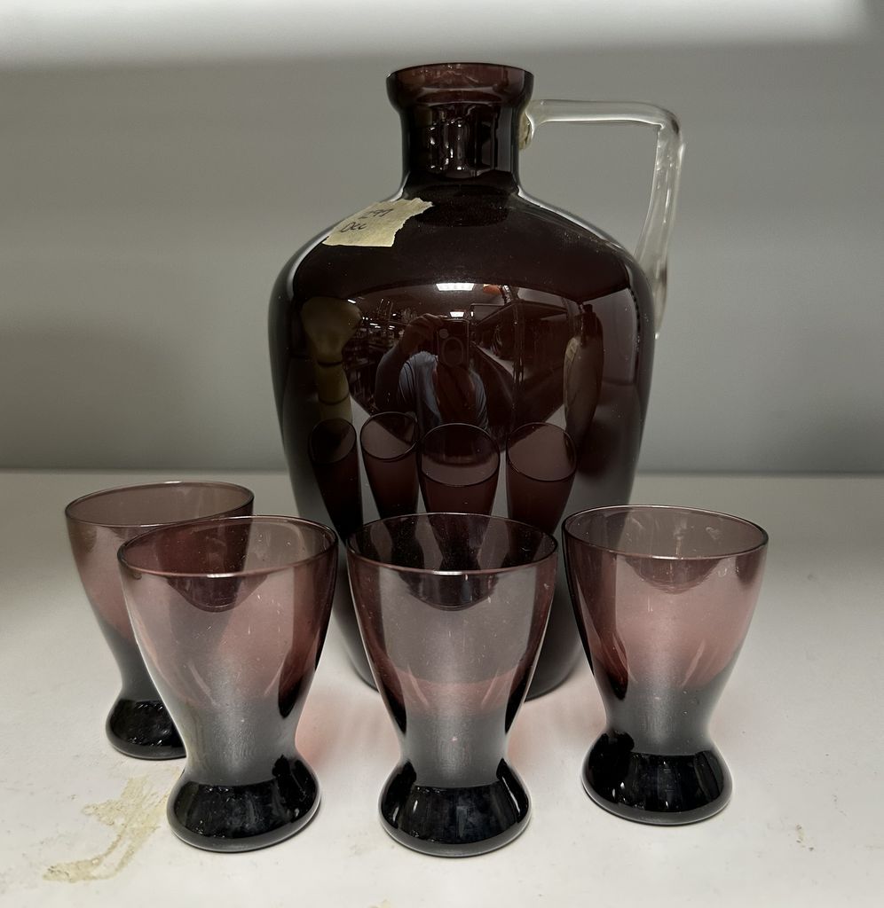 Smokey Rose Glass Pitcher Set, four cups, Location Back Metal Shelves Smokey Rose Glass Pitcher Set, four cups, Location Back Metal Shelves