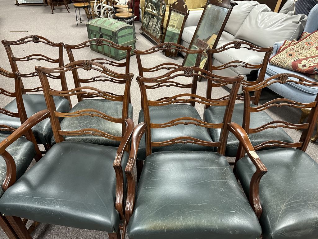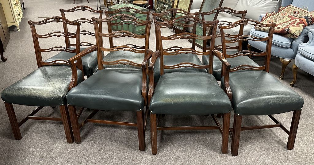 8 Mahogany Chippendale Dining Chairs, seat have usage wear, two arms, 6 sides, Location Row 5 8 Mahogany Chippendale Dining Chairs, seat have usage wear, two arms, 6 sides, Location Row 5