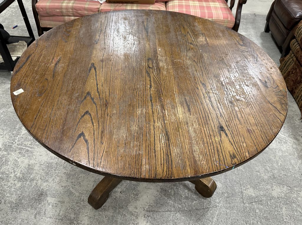 Late 20th Century Round Oak Pedestal Table, 30"h., 48"dia, Location Row 3 Late 20th Century Round Oak Pedestal Table, 30"h., 48"dia, Location Row 3
