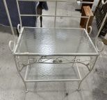White metal baker's Rack, glass shelves, good condition, 68"h., 31"w. Location Row 2 White metal baker's Rack, glass shelves, good condition, 68"h., 31"w. Location Row 2
