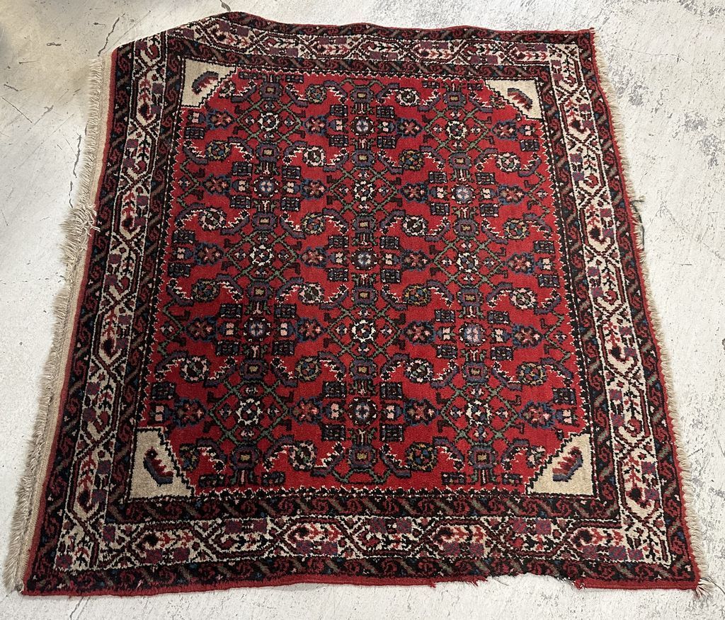 Iran Hand Woven Wool Rug, 3'9 x 3'9, some wear, Location Rug Rack Iran Hand Woven Wool Rug, 3'9 x 3'9, some wear, Location Rug Rack