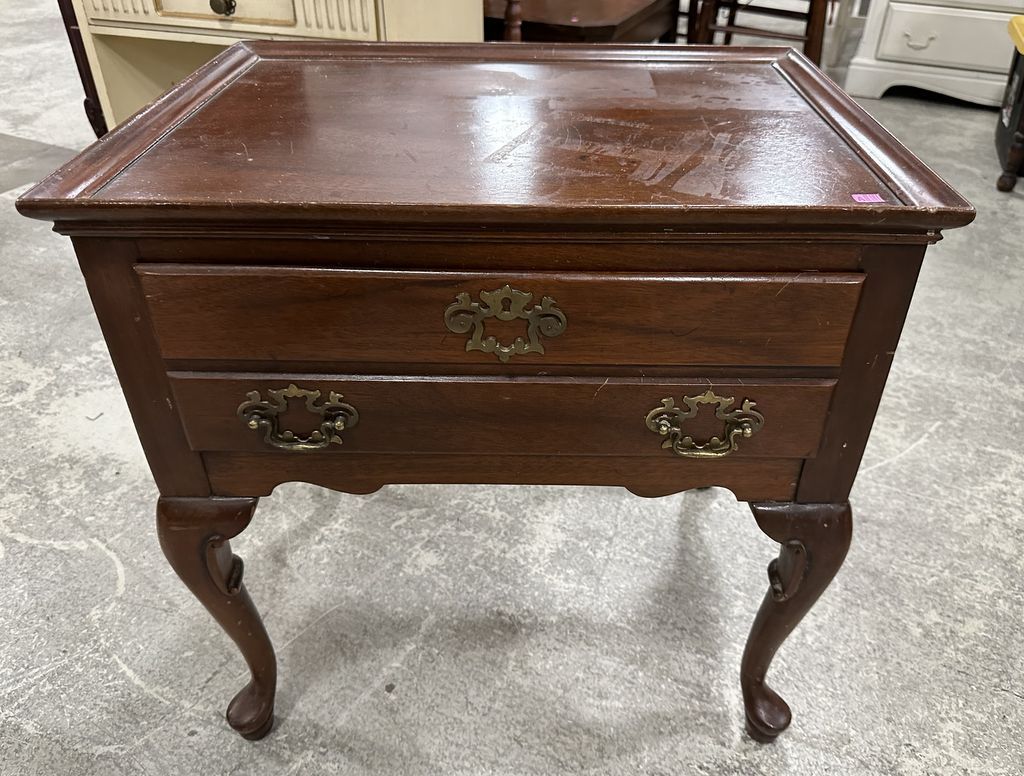 Mahogany Queen Anne Nightstand/Accent Table, two drawers, Reproduction, some finish wear, two drawers 24"h., 24"w. 33"h., 35"w. 20"d Location Row 6 Mahogany Queen Anne Nightstand/Accent Table, two drawers, Reproduction, some finish wear, two drawers 24"h., 24"w. 33"h., 35"w. 20"d Location Row 6