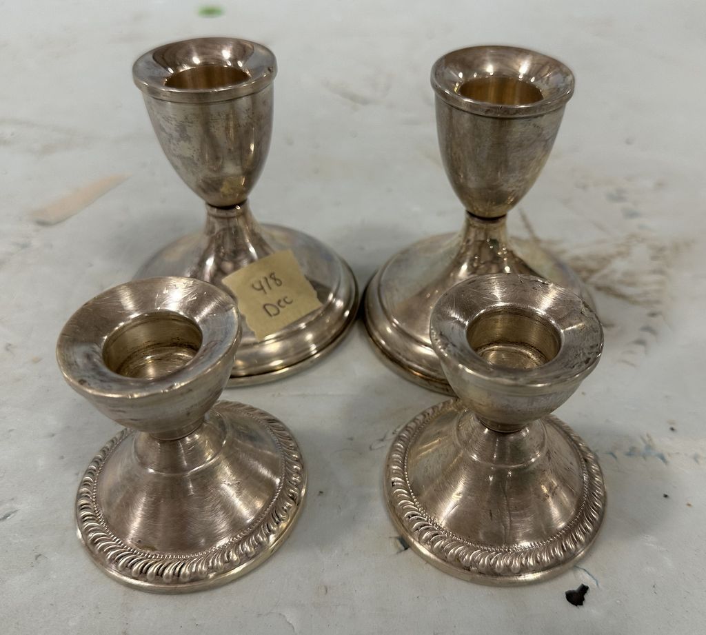 Two Pair of Weighted Sterling Candle Holders, Preismer, have dents, 4"h, Location Front Left Case Two Pair of Weighted Sterling Candle Holders, Preismer, have dents, 4"h, Location Front Left Case
