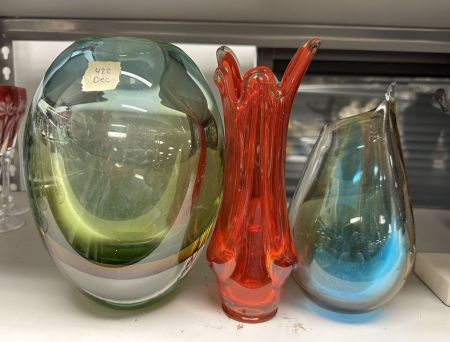 Three Art Glass Vases, Location Back Metal Shelves Three Art Glass Vases, Location Back Metal Shelves