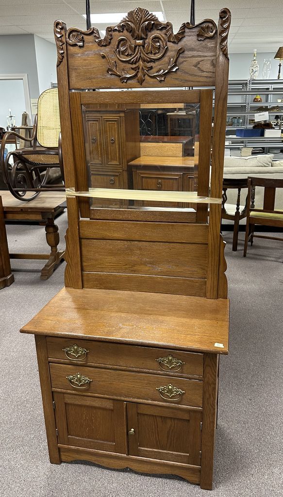 1910-20 Victorian Oak Low Boy Dresser, beveled mirror, 75"h., 32"w. Location Row 4 1910-20 Victorian Oak Low Boy Dresser, beveled mirror, 75"h., 32"w. Location Row 4
