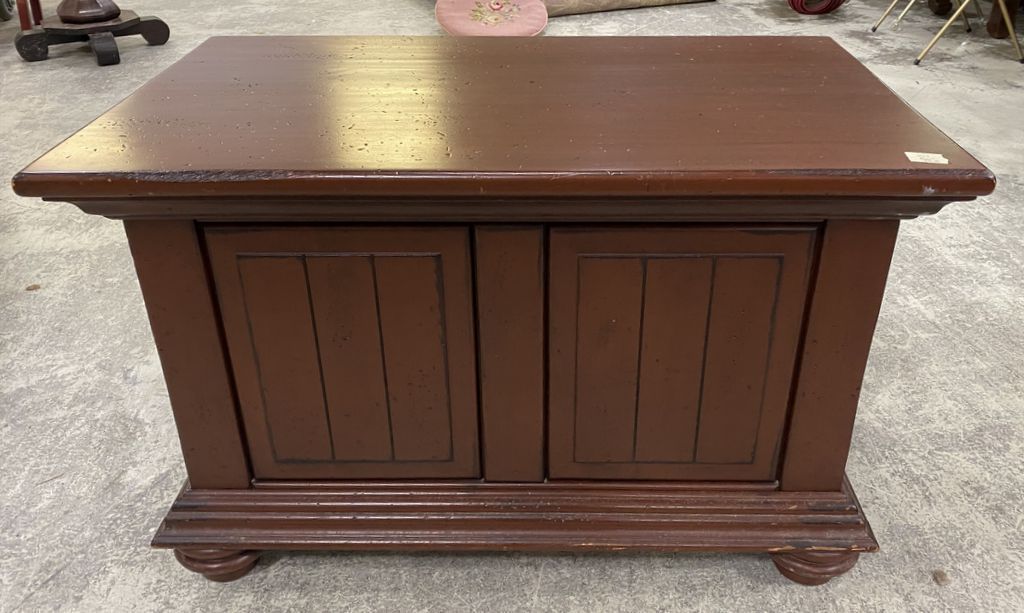 Primitive Style Painted Storage Chest, lift top, included quilts, 22"h., 34"w. Location Row 6 Primitive Style Painted Storage Chest, lift top, included quilts, 22"h., 34"w. Location Row 6