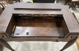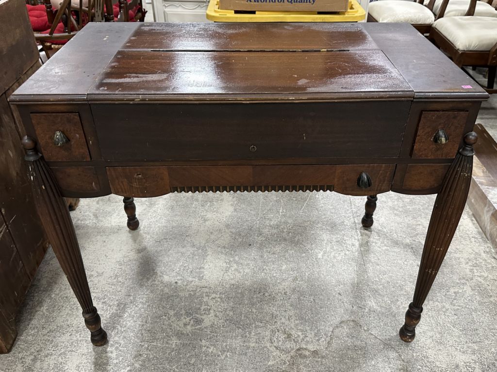 Early 20th Century Writing Spinet Desk, folding, mahogany, finish wear. 33"h., 39"w. 20"d. Location Row 6 Early 20th Century Writing Spinet Desk, folding, mahogany, finish wear. 33"h., 39"w. 20"d. Location Row 6