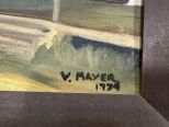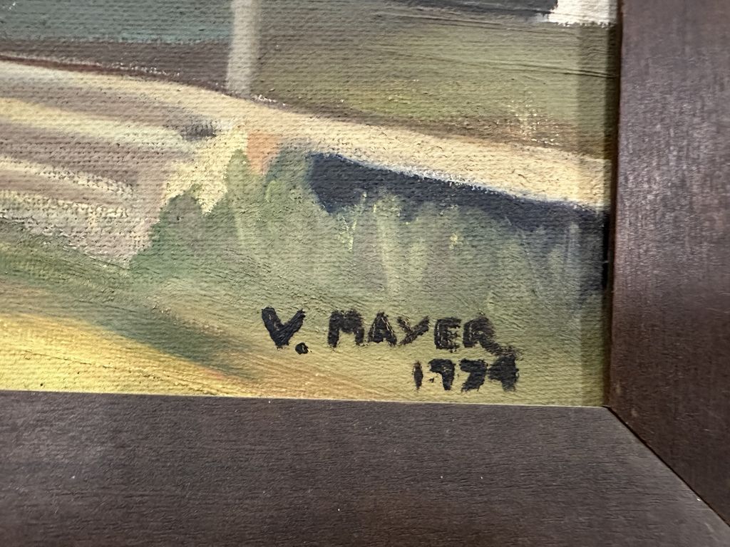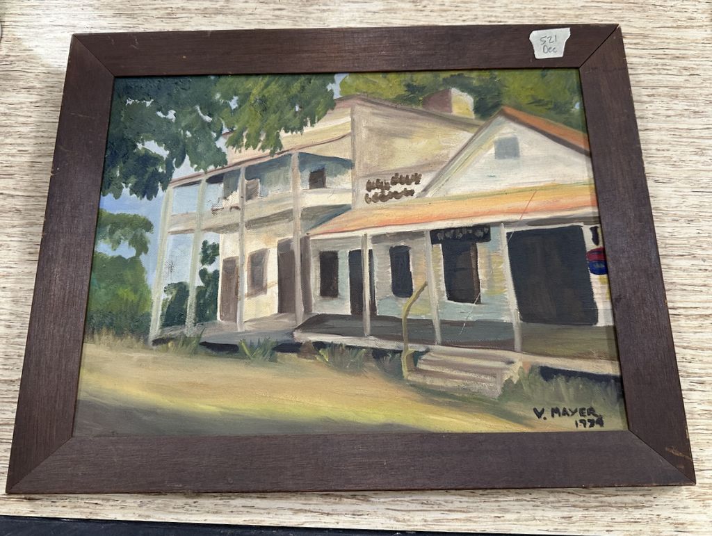Signed V. Mayer 1974 Painting of Store, on board, framed, 14"h., 18"w. Location Right Metal Shelves Signed V. Mayer 1974 Painting of Store, on board, framed, 14"h., 18"w. Location Right Metal Shelves