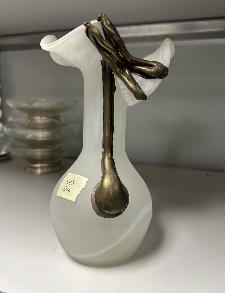 Art Nouveau Frosted Glass, 8"h, Location Back Metal Shelves Art Nouveau Frosted Glass, 8"h, Location Back Metal Shelves