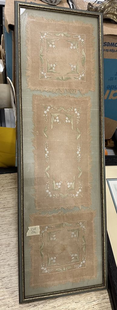 Framed Antique Line Napkins, 32"h. 10"w. Location Back Wall Framed Antique Line Napkins, 32"h. 10"w. Location Back Wall