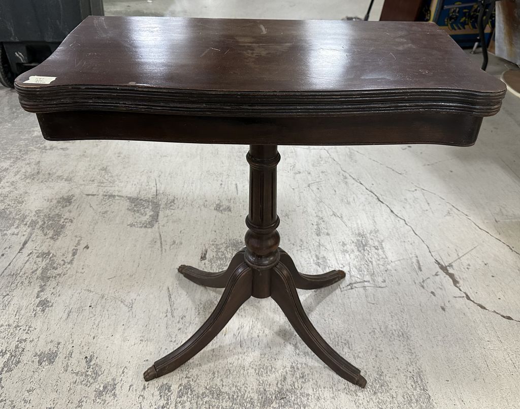 Duncan Phyfe Mahogany Pedestal Game Table, has finish wear, 30"h., 28"w. Location Left Office 1 Duncan Phyfe Mahogany Pedestal Game Table, has finish wear, 30"h., 28"w. Location Left Office 1