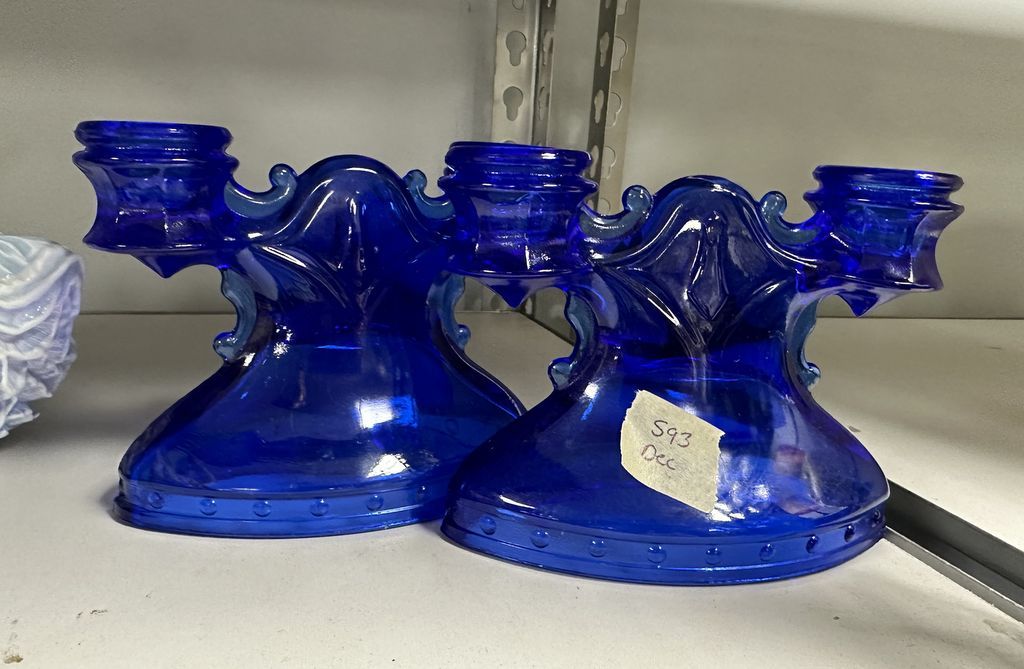 Pair of Blue Candle Sticks, Location Back Metal Shelves Pair of Blue Candle Sticks, Location Back Metal Shelves