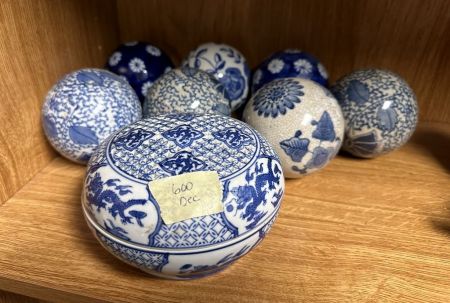 Blue and White Porcelain Balls and Covered Dish, Location Right Office 3 Blue and White Porcelain Balls and Covered Dish, Location Right Office 3